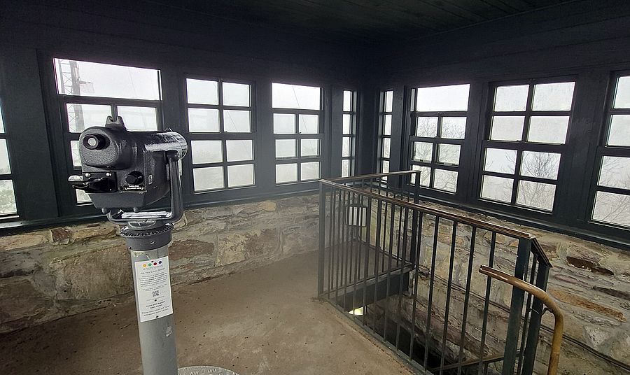 Nur wenige Meter sind es nach Überquerung der Straße bis zum Steingebäude des Bunker Tower. In dessen Erdgeschoß ist ein kleines Museum zur Erinnerung an das Civilian Conservation Corps (CCC) eingerichtet, mit dem die Massenarbeitslosigkeit während der großen Depression zu Beginn der 1930er Jahre in den USA bekämpft wurde. Aufgrund der tief hängenden Wolken bringt der Aufstieg auf den Bunker Tower keine Aussicht.