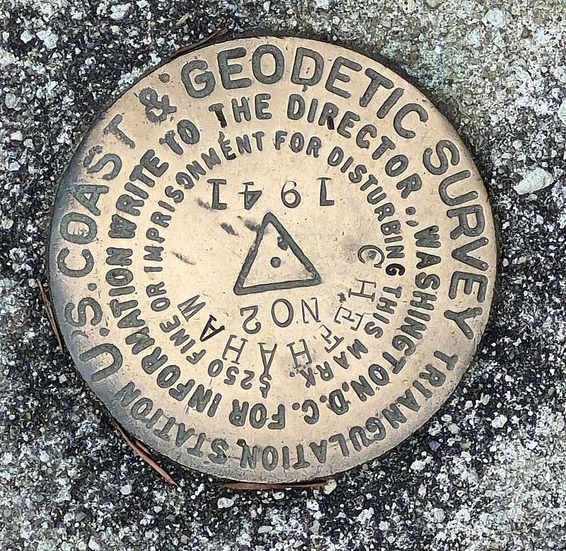 Im gepflasterten Eingangsbereich vor dem Gebäude ist auch der offizielle Vermessungspunkt für diesen State High Point in den Gehwegplatten eingelassen.