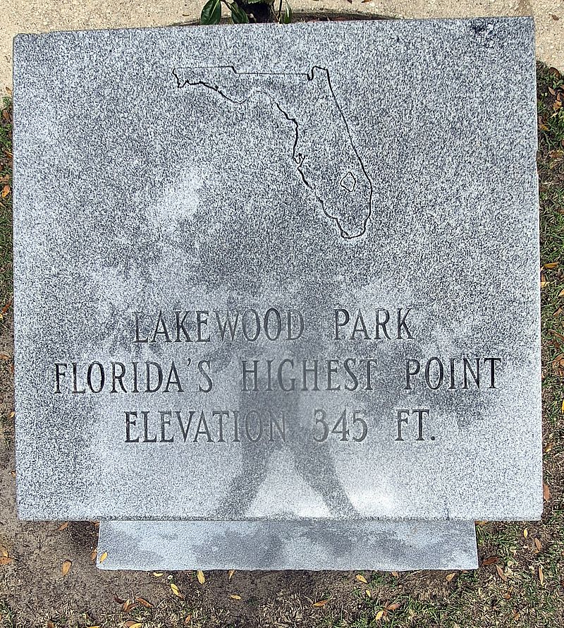 Lakewood Park, einem familienfreundlichen Picknickareal mit kleinem Waldgebiet im Farmland Nordflorida knapp 0,7 Meilen südlich der Grenze zum US-Bundesstaat Alabama (Anfahrtbeschreibung siehe oben). Vom Parkplatz sind es nur wenige Meter bis zu einer markanten Granitstele welche den höchsten Punkt schmückt. Wer dem nicht traut kann über 3 markierte Wege im angrenzenden Waldgebiet (White, Blue und Red